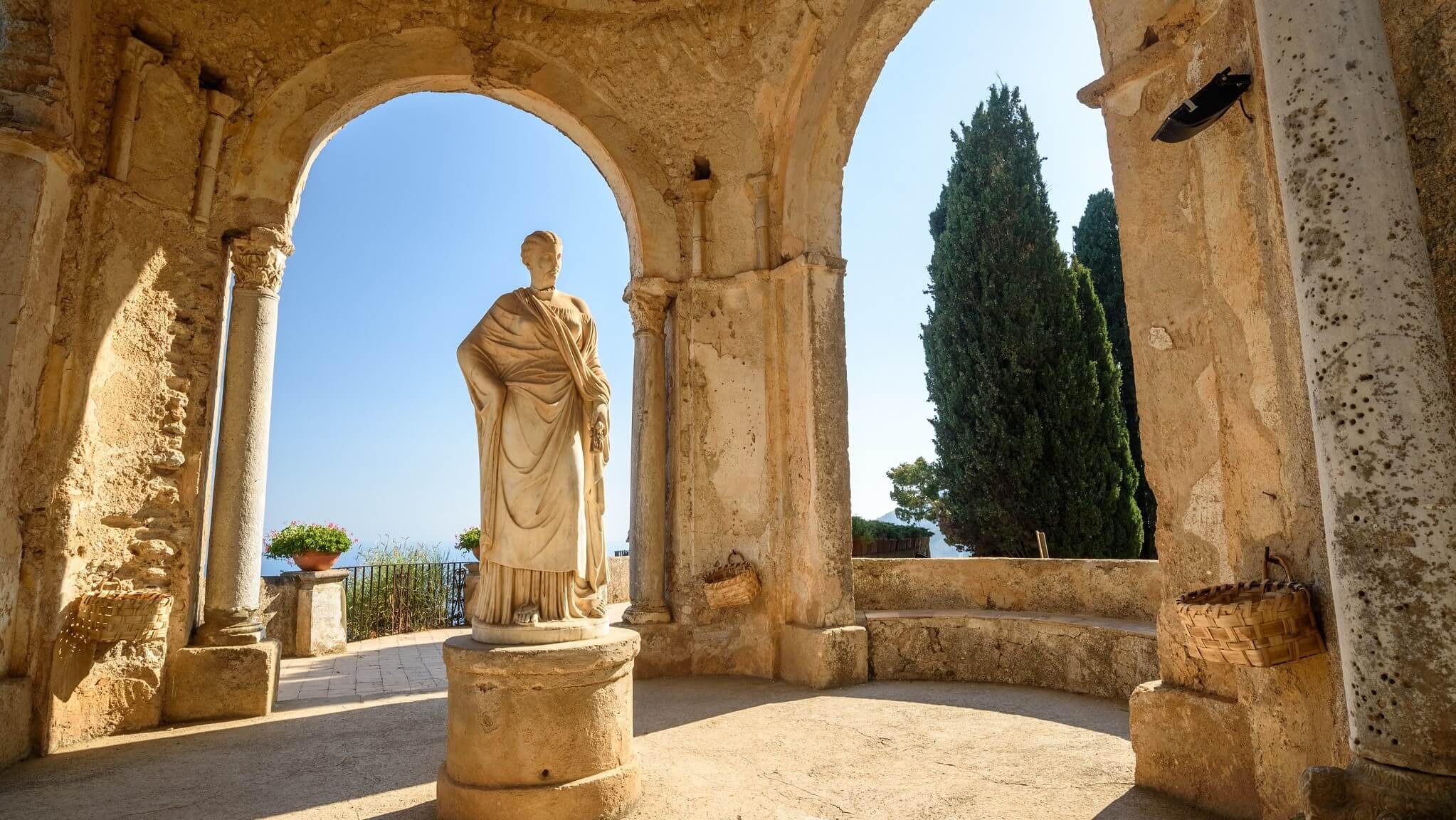 After lunch move to Ravello and explore the town and its beautiful villas of Rufolo and Cimbrone on your own. Founded in the 6th century, Ravello is situated in one of the broadest views of the coast. Its historical origins are not certain; it was probably founded by a Roman colony in the 6th century. Trade flourished between the 10th and 13th centuries after becoming the seat of diocese and thanks to the flourishing maritime trade, and the production of cotton and wool. The village still treasures its medieval aspect: the windy streets, houses, churches with beautiful mosaics testify the Roman, Byzantine and Southern Arab influence.